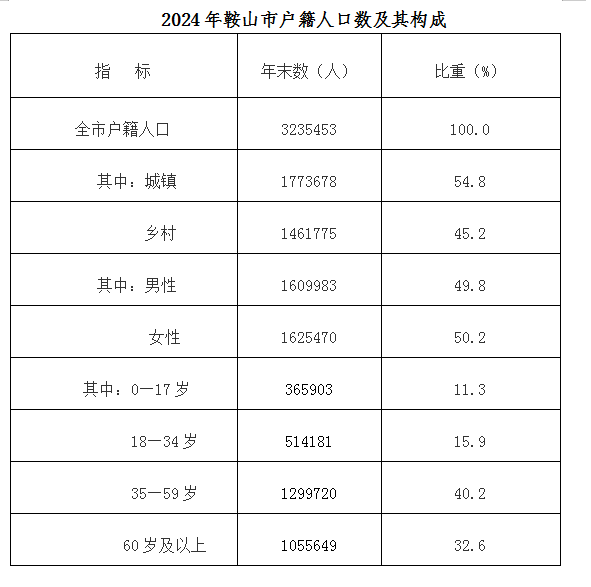 城镇生齿177.3万人。女性生齿162.5万人,城镇职工根基医疗安全参保人数99.7万人,灭亡率10.21‰。此中,2024年,出生率3.96‰;岫岩县生齿48.2万人。征缴安全费30.4亿元;全市出生生齿12857人,市辖区生齿138.7万人。