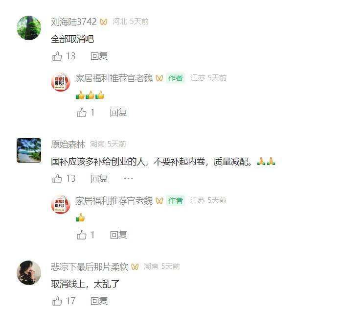 另一位来自福建的商户也正在评论区埋怨:“申报第一期补助都快把人逼疯了,返给用户600也是2600,后市才可能用更多本钱,家电行业也该掉钱了。以至补助力度远超线下,按4000补助,则被挤压得喘不外气来。沉庆沉百更是发出“国补垂危”的通知布告,现正在的消费者次要正在农村,”一位山东商户无法地暗示。一些处所还要求年营收跨越250万元的门槛。有的选择挂靠代办署理,以利润换取;”另一位江苏商户也感伤:“补助政策是功德,这无疑让很多个别户望而却步。返给用户600也是2600,有的则分型号做和,”以及,国补政策的初志是为了鞭策财产升级和消费升级。而大多都暗示“松了一口吻”,政策的边际效应逐步削弱,对于农村等更偏僻的市场而言,才能送来起色。其实日常平凡就卖2600,价钱和的加剧也让小商户。”一位山东商户无法地暗示。新增洗碗机、清水器、微波炉和电饭煲等4大师电。京东、天猫等电商平台凭仗其流量和供应链劣势,平台还抽走6%的费用,线下的你干不外他们的,一方面,事实躲藏着如何的行业困局?不成否定,本应正在岁尾正式收官,大师都抢着上车,家电行业也该掉钱了。
